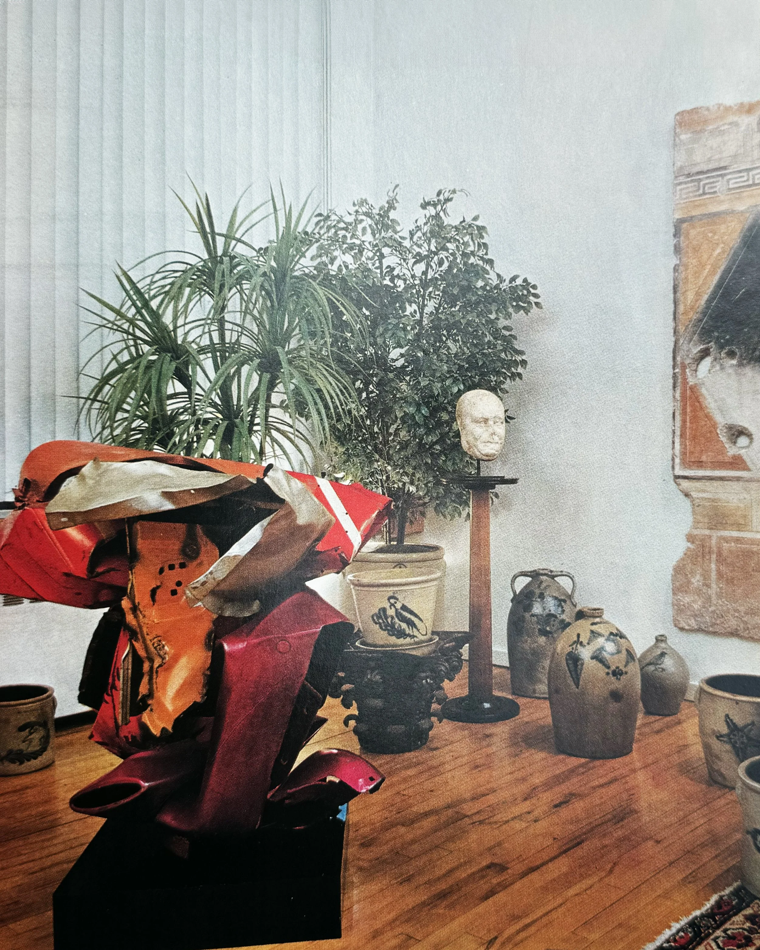 Then, we turn to the New York apartment of Marilynn and Ivan Karp. In their studio corner, you'll see a dramatic interplay of eras. A vibrant, almost explosive, John Chamberlain metal sculpture, clearly modern and dynamic, finds surprising balance among Peter Saari's contemporary Pompeian Fresco, a classical head of the Roman Emperor Balbinus, and a collection of American salt-glaze stoneware. This mix, from ancient classical to avant-garde and folk art, demonstrates a confident boldness, proving that coherence isn't about matching, but about a compelling dialogue between different forms.
